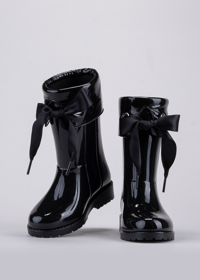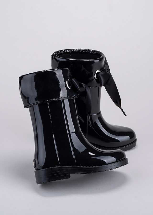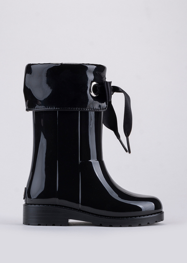 Botas de agua con detalle de lazo de raso en el cuello. Acabado brillo, plantilla confort extraíble...