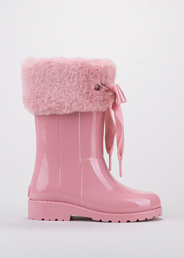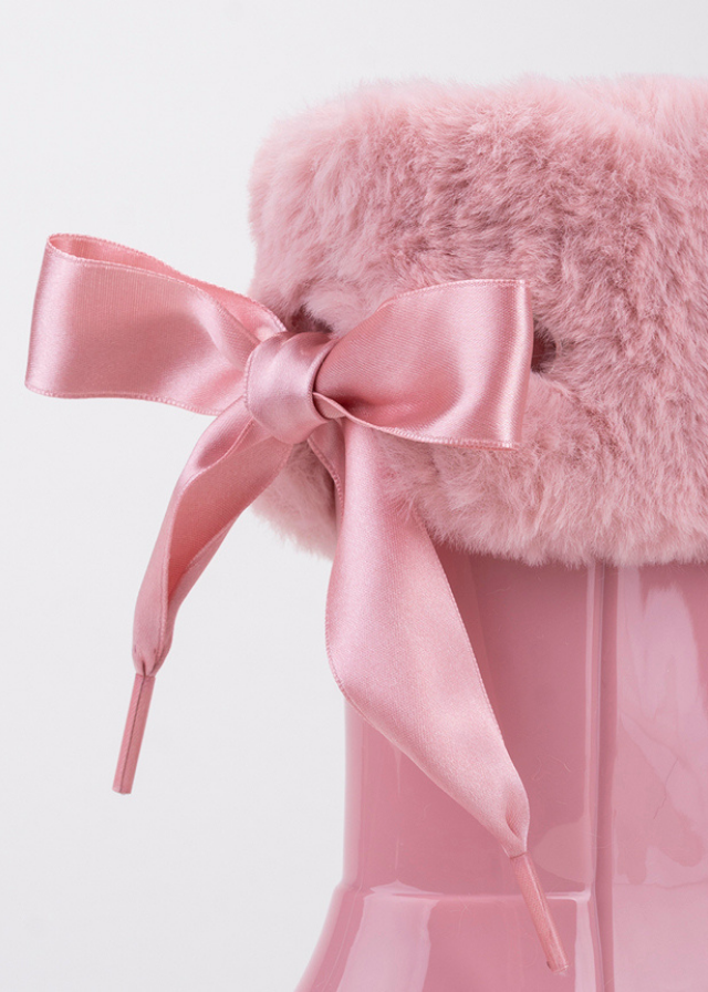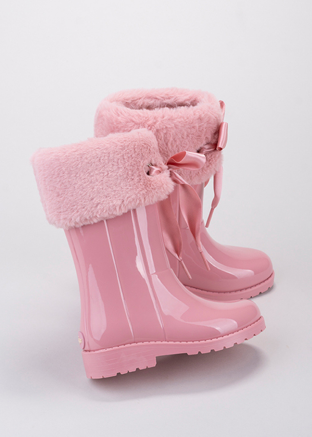 Botas de agua con cuello de pelo y detalle de lazo de raso. Acabado brillo, plantilla confort...