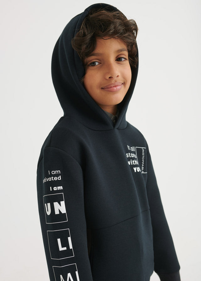 Sudadera de manga larga para chico. Cuello con capucha. Bolsillo funcional de tipo canguro en el frontal...